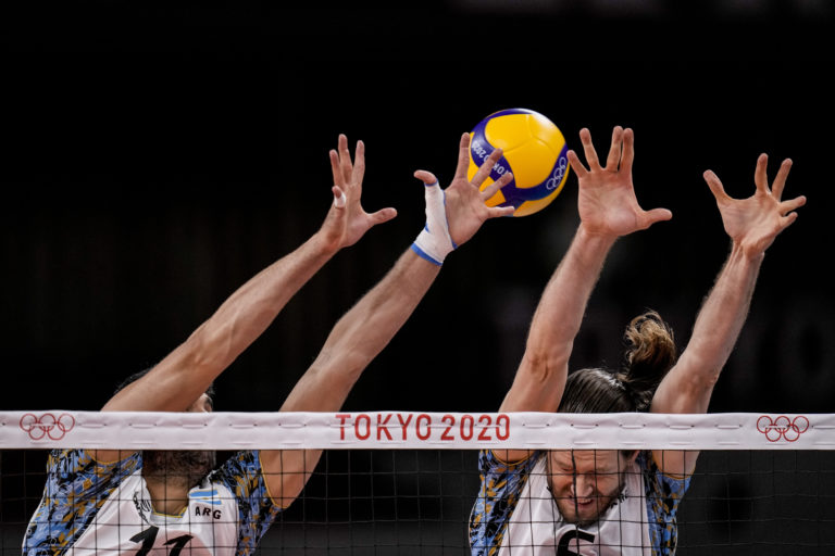 Argentínski volejbalisti Cristian Poglajen (vpravo) a Sebastian Sole sa snažia blockovať strelu počas zápasu mužov B skupiny proti Francúzsku na letnej olympiáde v Tokiu. Tokio, 28. júl 2021. Foto: SITA/AP