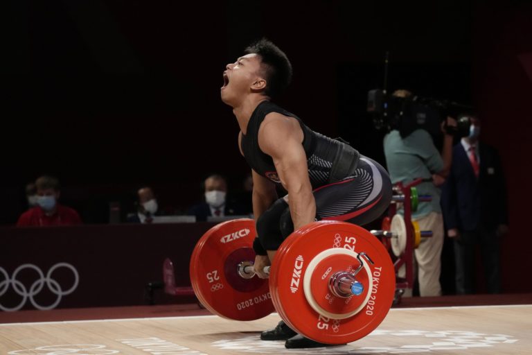 Reprezentant Indonézie Abdullah Rhamat Erwin súťaží v disciplíne vzpierania mužov do 73 kg na letnej olympiáde v Tokiu. Tokio, 28. júl 2021. Foto: SITA/AP