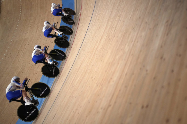 Francúzsky ženský tím počas stíhacích pretekov v dráhovej cyklistike na letnej olympiáde v Tokiu. Izu, 3. august 2021. Foto: SITA/AP