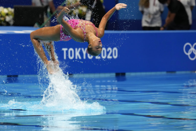 Akvabely Laila Ali a Hanna Hiekal z Egypta počas svojho vystúpenia na letnej olympiáde v Tokiu. Tokio, 3. august 2021. Foto: SITA/AP