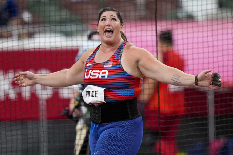 Americká kladivárka Deanna Priceová po svojom pokuse vo finále hodu kladivom žien na letnej olympiáde v Tokiu. Tokio, 3. august 2021. Foto: SITA/AP