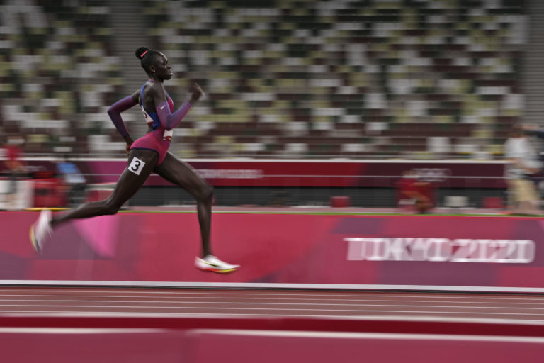 Američanka Athing Mu si beží pre víťazstvo počas finálového behu žien na 800 metrov na letnej olympiáde v Tokiu. Tokio, 3. august 2021. Foto: SITA/AP