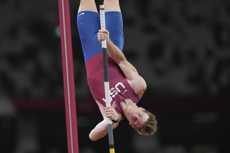 Christopher Nilsen z USA počas svojho pokusu v skoku o žrdi na letnej olympiáde v Tokiu. Tokio, 3. august 2021. Foto: SITA/AP