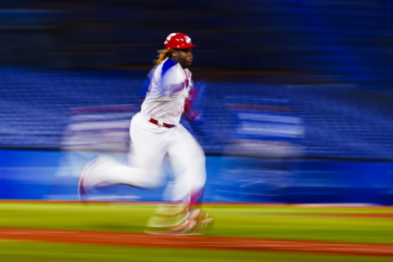 Johan Mieses z Dominikánskej republiky beží na prvú métu počas baseballového zápasu na letnej olympiáde v Tokiu proti Izraelu. Jokohama, 3. august 2021. Foto: SITA/AP