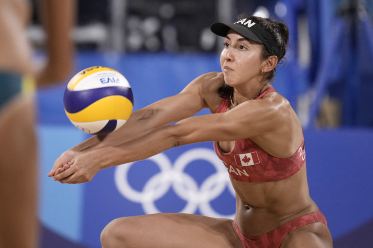 Melissa Humana-Paredesová z Kanady počas zápasu v plážovom volejbale žien proti Austrálii na letnej olympiáde v Tokiu. Tokio, 3. august 2021. Foto: SITA/AP