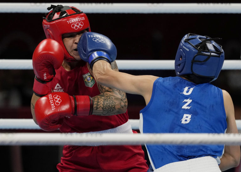 Brazílčanka Beatriz Ferreira (vľavo) inkasuje úder od Raykhony Kodirovej z Uzbekistanu počas zápasu ľahkej váhy v boxe žien na letnej olympiáde v Tokiu. Foto: SITA/AP