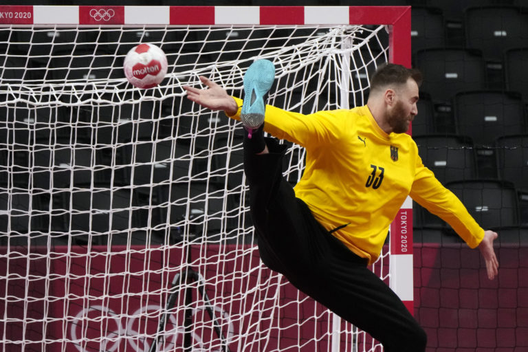 Nemecký brankár Andreas Wolff v akcii počas štvrťfinálového zápasu v hádzanej mužov proti Egyptu na letnej olympiáde v Tokiu. Tokio, 3. august 2021. Foto: SITA/AP