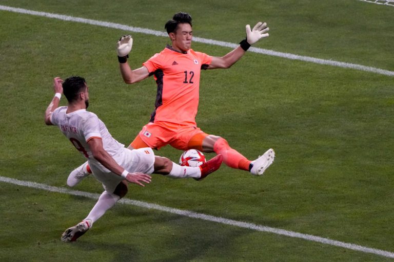 Japonský brankár Kosei Tani blokuje strelu Španiela Rafu Mira počas semifinálového zápasu vo futbale na letnej olympiáde v Tokiu medzi Japonskom a Španielskom. Saitama, 3. august 2021. Foto: SITA/AP