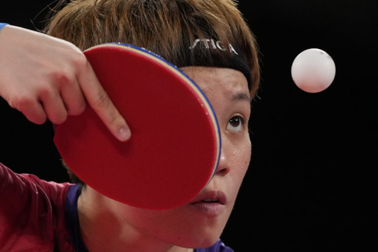 Doo Hoi-kem z Hong Kongu podáva počas zápasu v stolnom tenise žien proti japonskej súperke Mima Ito na letnej olympiáde v Tokiu. Tokio, 3. august 2021. Foto: SITA/AP