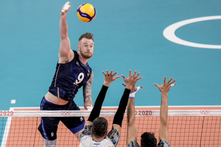 Ivan Zajcev z Talianska smečuje loptu počas volejbalového zápasu mužov medzi Talianskom a Argentínou na letnej olympiáde v Tokiu. Tokio, 3. august 2021. Foto: SITA/AP