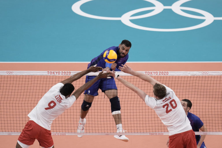 Francúz Earvin Ngapeth smečuje loptu medzi poľských hráčov počas zápasu vo volejbale mužov na letnej olympiáde v Tokiu. Tokio, 3. august 2021. Foto: SITA/AP