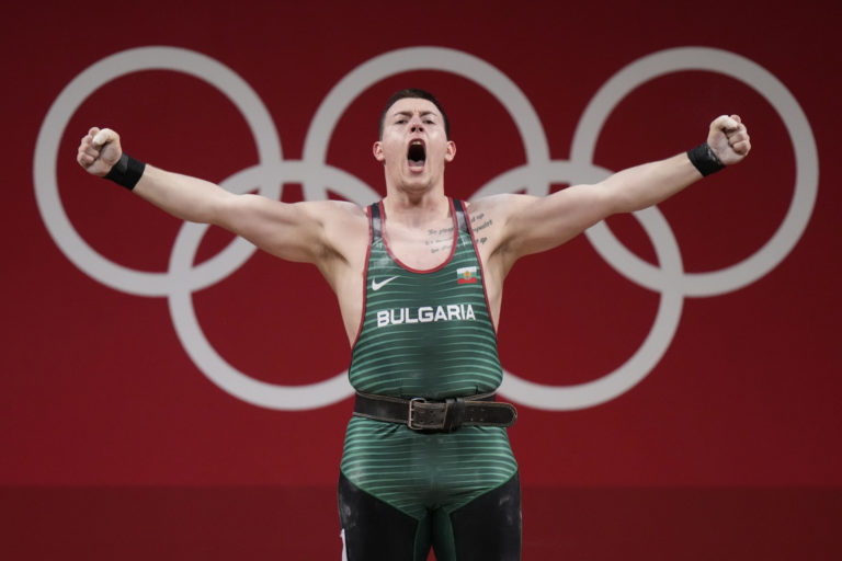 Bulharský vzpierač Hristo Dimitrov Hristov sa raduje zo svojho úspešného pokusu v kategórii do 109 kilogramov na letnej olympiáde v Tokiu. Tokio, 3. august 2021. Foto: SITA/AP