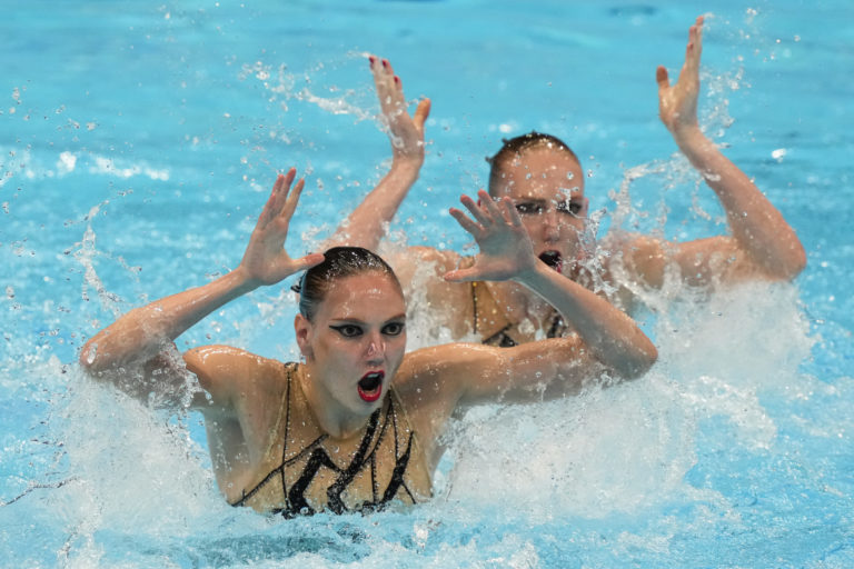 Ruské akvabely Svetlana Kolesničenková a Svetlana Romašinová získali zlaté medaily v súťaži dvojíc na letnej olympiáde v Tokiu. Tokio, 4. august 2021. Foto: SITA/AP.
