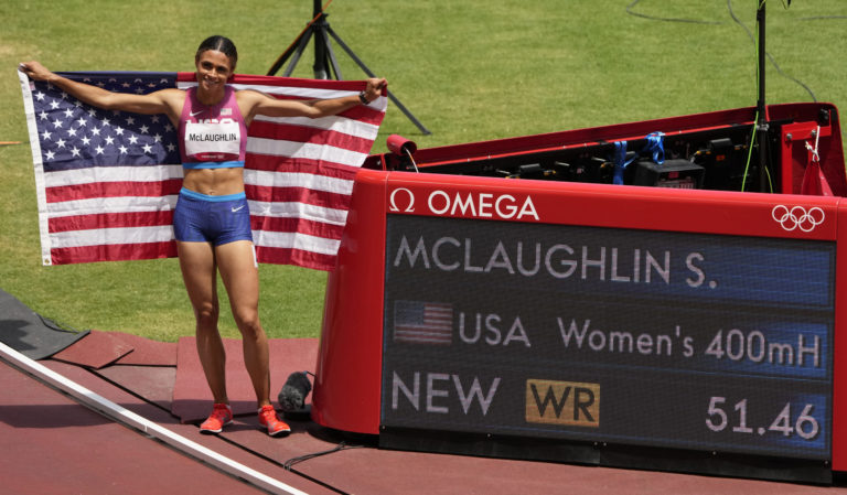 Američanka Sydney McLaughlinová na letnej olympiáde v Tokiu v pretekoch na 400 m cez prekážky o 44 stotín zlepšila svoj svetový rekord. Tokio, 4. august 2021. Foto: SITA/AP.