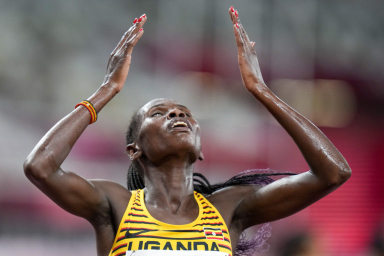 Ugandská bežkyňa Peruth Chemutaiová vybojovala pre svoju krajinu prvú zlatú medailu na olympiáde v Tokiu v behu na 3000 m cez prekážky. Tokio, 4. august 2021. Foto: SITA/AP.