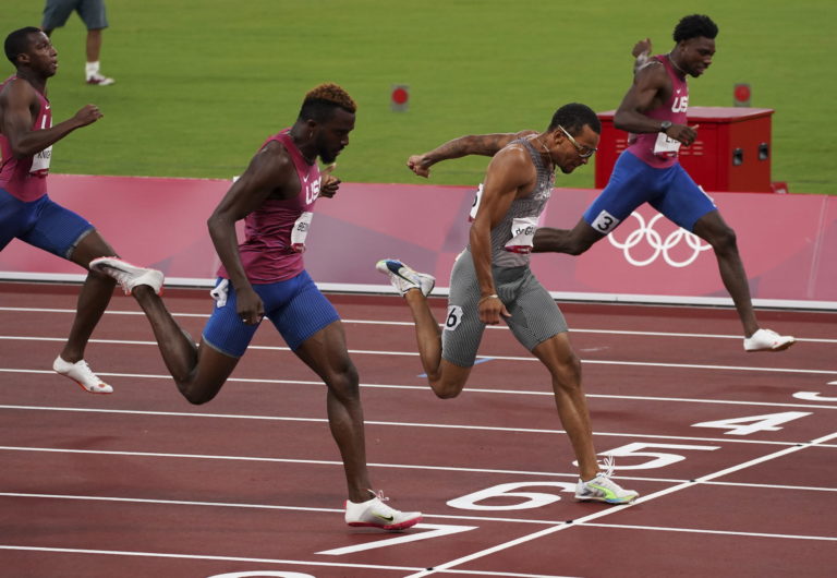 Kanadský pretekár Andre De Grasse vyhral zlato v behu na 200 m, strieborný bol Američan Kenneth Bednarek a bronz získal Američan Noah Lyles (vpravo) na letnej olympiáde v Tokiu. Tokio, 4. august 2021. Foto: SITA/AP.