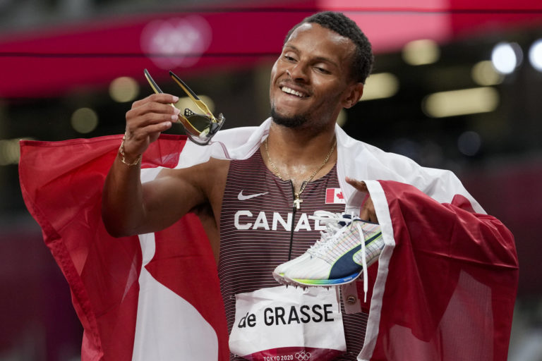 Kanadský pretekár Andre De Grasse vyhral zlato v behu na 200 m na letnej olympiáde v Tokiu. Tokio, 4. august 2021. Foto: SITA/AP.