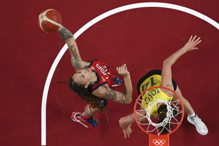 Americká basketbalistka Brittney Grinerová (15) a Austrálčanka Marianna Tolová (14) počas ženského basketbalového zápasu, v ktorom USA zvíťazili 79:55 a postúpili do finále na letnej olympiáde v Tokiu. Tokio, 4. august 2021. Foto: SITA/AP.
