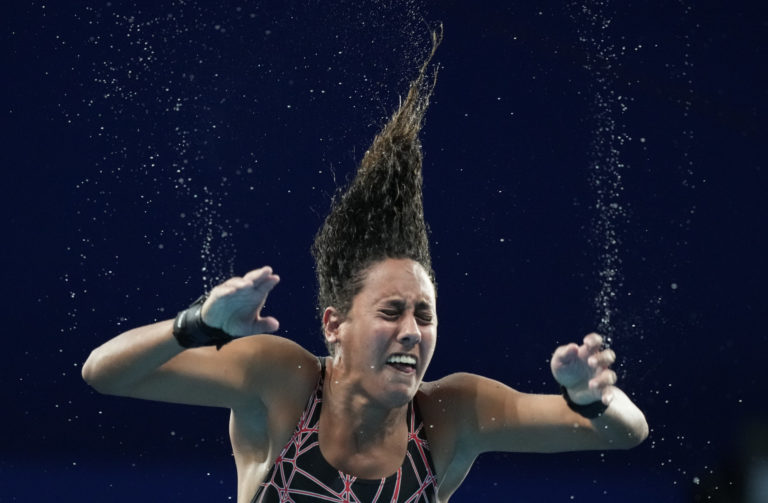 Egyptská reprezentantka Maha Goudaová počas kvalifikácie skokov do vody mostík 10 m na letnej olympiáde v Tokiu. Tokio, 4. august 2021. Foto: SITA/AP.