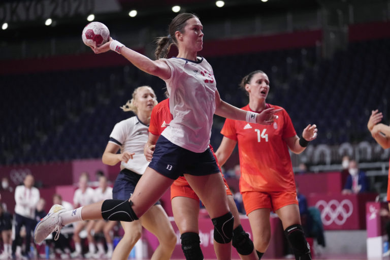 Nórska hádzanárka Kari Brattset Daleová (uprostred) skóruje počas štvrťfinále hádzanej žien proti Maďarkám na letnej olympiáde v Tokiu. Tokio, 4. august 2021. Foto: SITA/AP.
