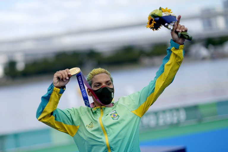 Brazílska reprezentantka Ana Marcela Cunhová sa stala víťazkou v diaľkovom plávaní a získala zlato na letnej olympiáde v Tokiu. Tokio, 4. august 2021. Foto: SITA/AP.