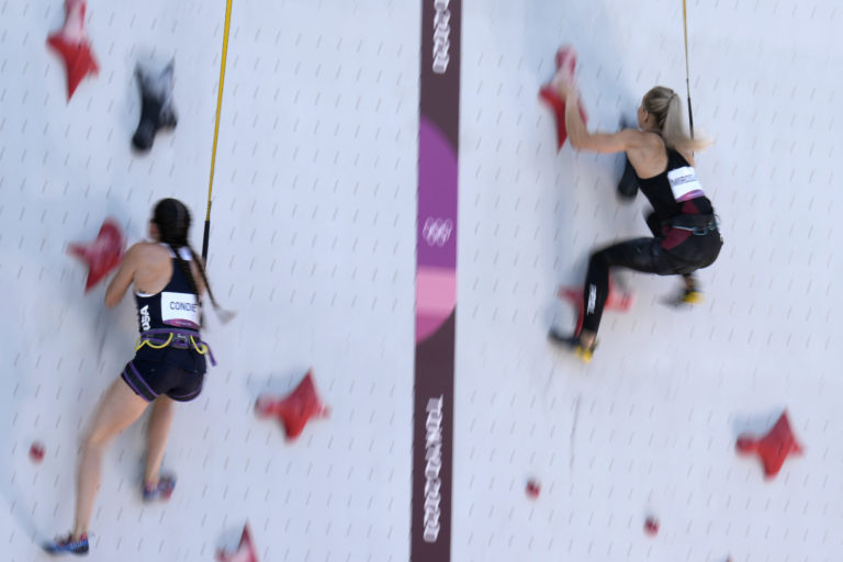 Američanka Kyra Condieová (vľavo) a Poľka Aleksandra Miroslawová (vpravo) počas kvalifikácie v rýchlosti v športovom lezení na letnej olympiáde v Tokiu. Tokio, 4. august 2021. Foto: SITA/AP.