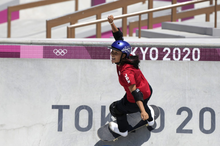 Radosť japonskej reprezentantky Sakury Josozumiovej, ktorá získala zlatú medailu v skejtboardingu na letnej olympiáde v Tokiu. Tokio, 4. august 2021. Foto: SITA/AP
