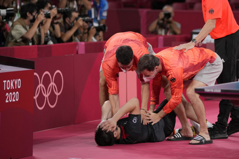 Nemecký reprezentant Dimitrij Ovtcharov (uprostred) oslavuje víťazstvo v stolnom tenise so svojím spoluhráčom proti Japonsku na letnej olympiáde v Tokiu. Tokio, 4. august 2021. Foto: SITA/AP.