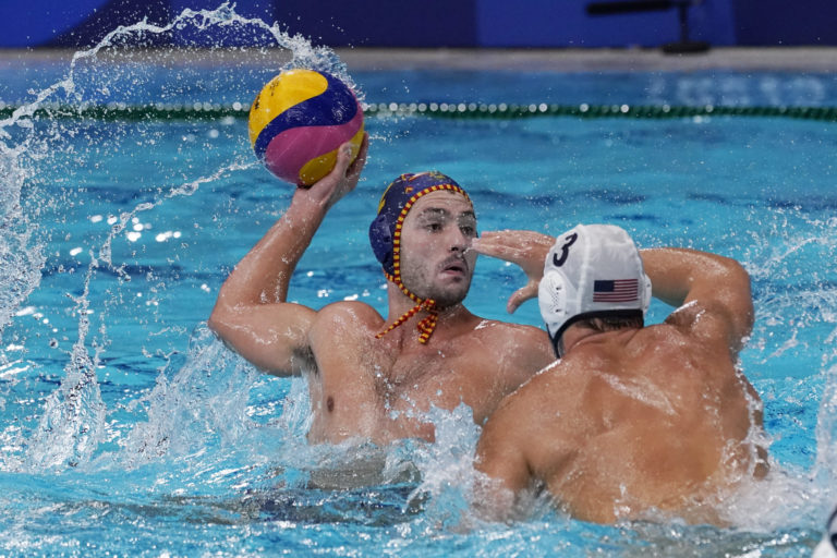 Španielsky reprezentant Alberto Munarriz Egana (2) hádže loptu počas zápasu vo vodnom póle proti Američanom na letnej olympiáde v Tokiu. Tokio, 4. august 2021. Foto: SITA/AP.