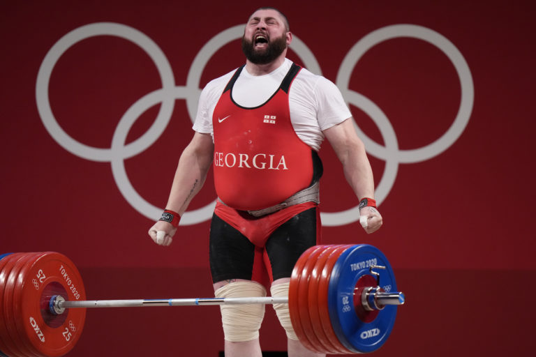 Gruzínsky vzpierač Laša Talachadze sa teší zo zisku zlatej medaily v kategórii na 109 kg na letnej olympiáde v Tokiu. Tokio, 4. august 2021. Foto: SITA/AP.
