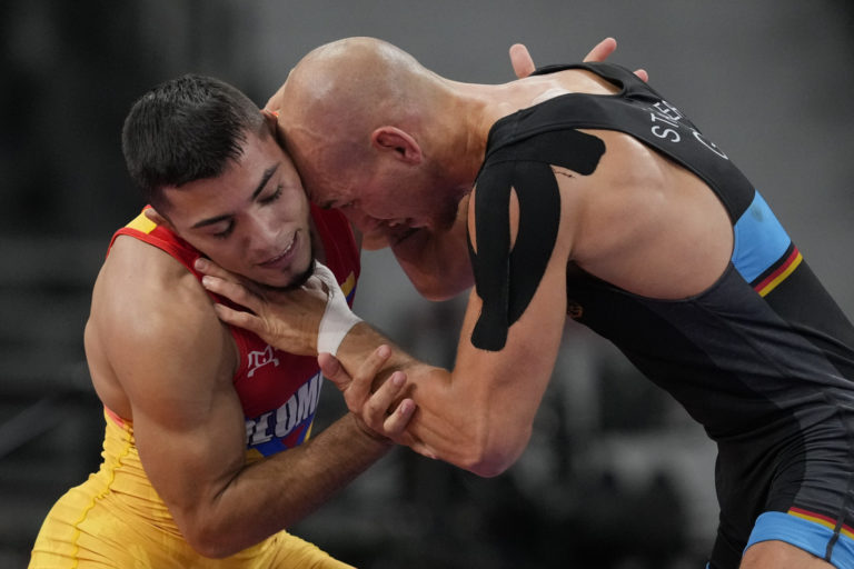 Kolumbijský zápasník Julian Horta Acevedo (vľavo) a Nemec Frank Staebler počas zápasenia mužov do 67 kg na letnej olympiáde v Tokiu. Čiba, 4. august 2021. Foto: SITA/AP.