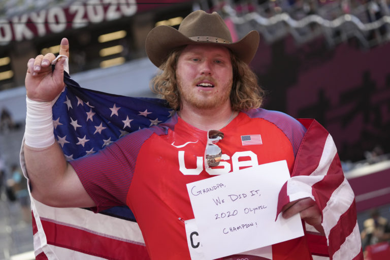 Američan Ryan Crouser oslavuje zisk zlatej medaily vo vrhu guľou na letnej olympiáde v Tokiu. Tokio, 5. august 2021. Foto: SITA/AP.