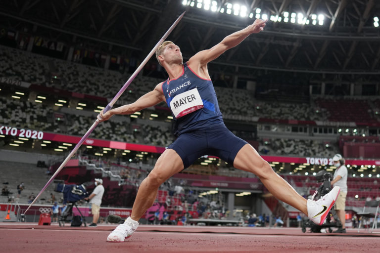 Francúzsky reprezentant Kevin Mayer počas hodu oštepom na letnej olympiáde v Tokiu. Tokio, 5. august 2021. Foto: SITA/AP.