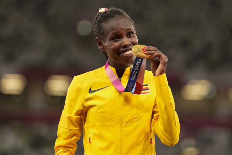 Ugandská pretekárka Peruth Chemutaiová získala zlatú medailu v behu žien na 3000 m na letnej olympiáde v Tokiu. Tokio, 5. august 2021 Foto: SITA/AP.