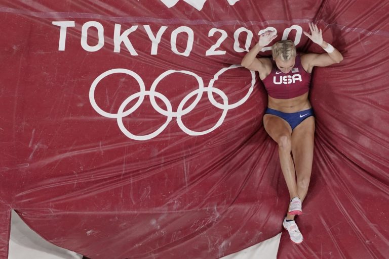 Americká reprezentantka Katie Nageotteová získala zlatú medailu, keď prekonala výšku 4,9 m v skoku o ždri na letnej olympiáde v Tokiu. Tokio, 5. august 2021. Foto: SITA/AP.