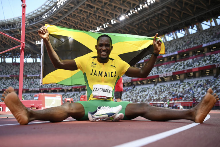 Jamajčan Hansle Parchment sa stal olympijským víťazom v behu na 110 prekážok na letnej olympiáde v Tokiu. Tokio, 5. august 2021. Foto: SITA/AP.