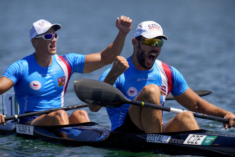 Česi Radek Slouf a Josef Dostál sa tešia zo zisku bronzových medailí v K2 na 1000 m na letnej olympiáde v Tokiu. Tokio, 5. august 2021. Foto: SITA/AP.