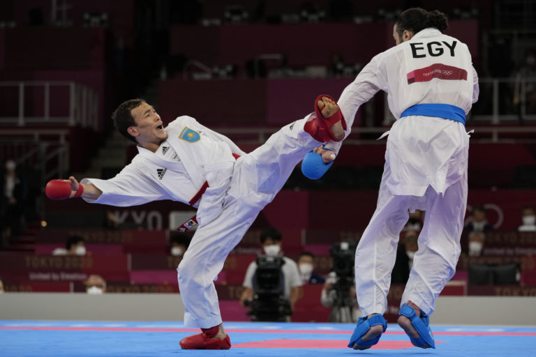 Reprezentant Kazachstanu Darkhan Assadilov (vľavo) poča ssúboja v karate proti Egypťanovi Alimu Elsawymu na letnej olympiáde v Tokiu. Tokio, 5. august 2021. Foto: SITA/AP.