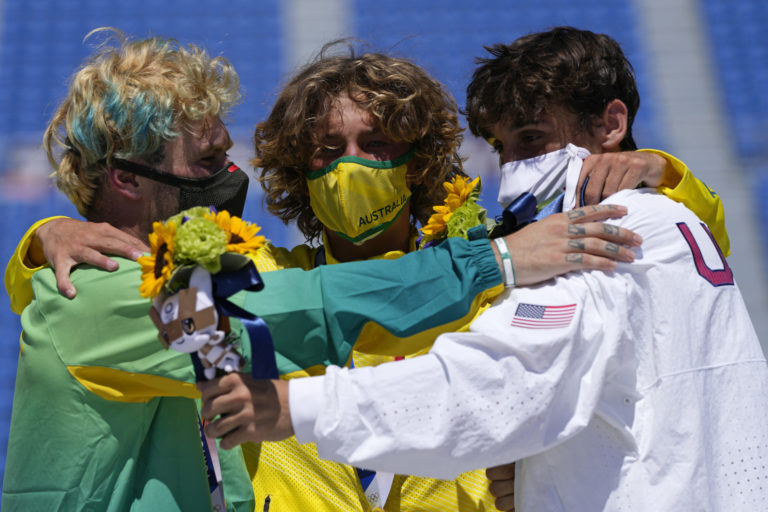 Zľava: Strieborný medailista Pedro z Brazílie, zlatú medailu v skejtboarde získal Austrálčan Keegan Palmer a bronz má Američan Cory Juneau na letnej olympiáde v Tokiu. Tokio, 5. august 2021. Foto: SITA/AP.