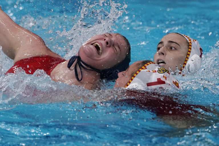 Maďarská reprezentantka Aniko Gyongyossyová (vľavo) a Španielky Maica Garcia Godoyová (11) a Bea Ortizová (4) počas semifinálového zápasu žien vo vodnom póle na letnej olympiáde v Tokiu. Tokio, 5. august 2021. Foto: SITA/AP.