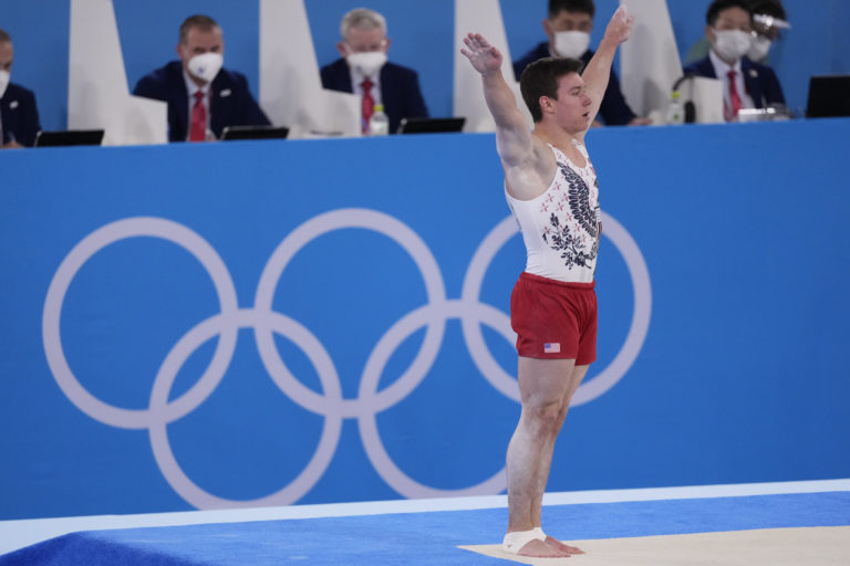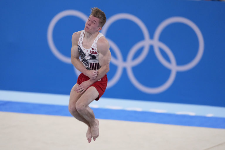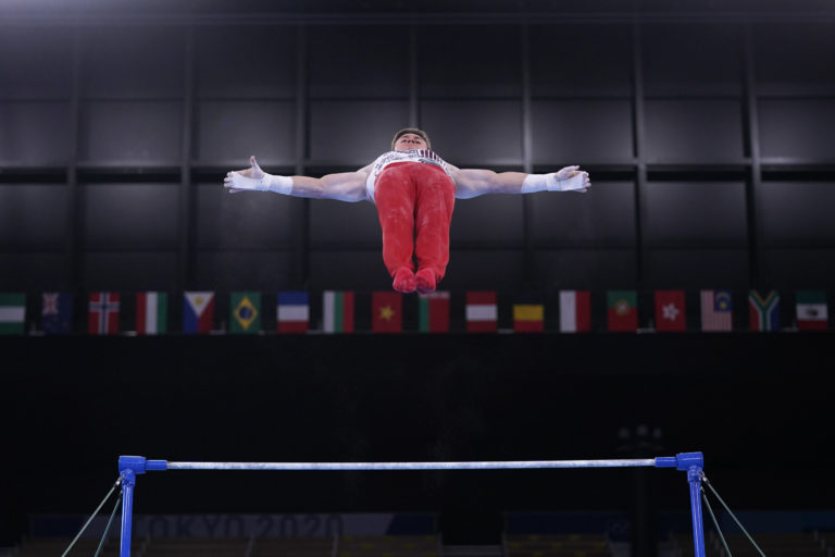Americký gymnasta Brody Malone predvádza na hrazde svoju zostavu počas Letných olympijských hier 2020/2021 v Tokiu. Japonsko, Tokio, 24. júl 2021. Foto: SITA/AP