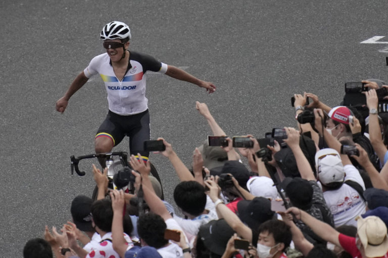 Ekvádorčan Richard Carapaz sa stal olympijským víťazom v cestných pretekoch mužov s hromadným štartom na olympijských hrách v Tokiu. Japonsko, Tokio, 24. júla 2021. Foto: SITA/AP