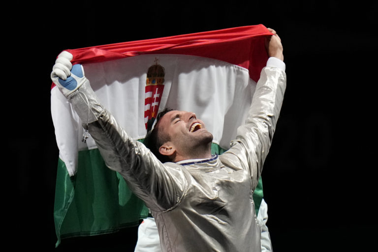 Maďarský šermiar Aron Szilágyi sa teší zo zisku zlatej medaily po finále s Talianom Luigim Sameleom na Letnej olympijských hrách 2020/2021 v Tokiu. Japonsko, Čiba, 24. júl 2021. Foto: SITA/AP