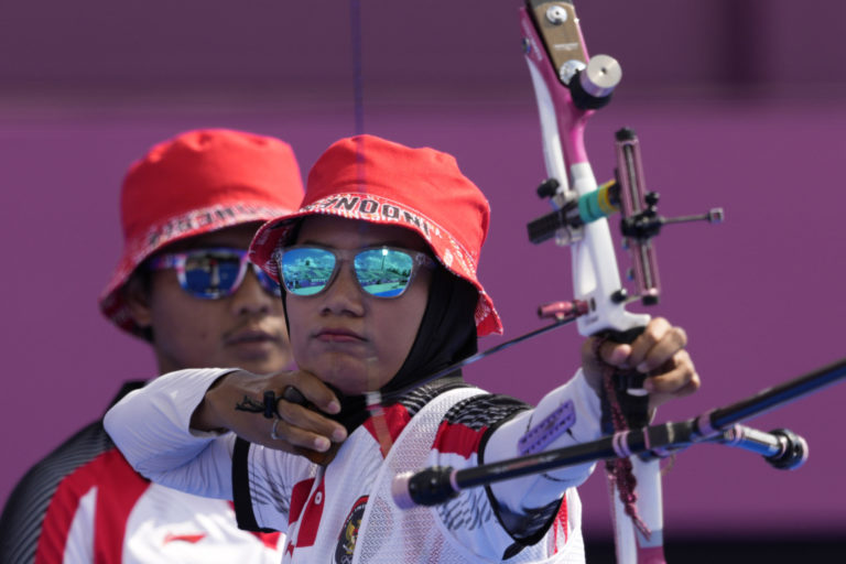 Indonézska strelkyňa Diananda Choirunisa počas streľby v zmiešaných tímoch na letných olympijských hrách v Tokiu. Japonsko, Tokio, 24. júla 2021. Foto: SITA/AP