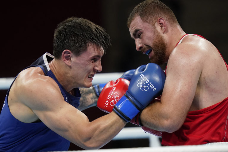 Azerbajdžanský reprezentant Mahammad Abdullayev (vpravo) si vymieňa údery s bahrajnským reprezentantom Danisom Latypovom počas boxu v ťažkej váhe do 91 kg na Letných olympijských hrách 2020/2021 v Tokiu. Japonsko, Tokio, 24. júl 2021. Foto: SITA/AP
