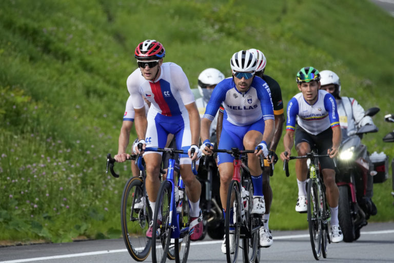 Slovenský cyklista Juraj Sagan (vľavo) počas cestných pretekov mužov s hromadným štartom na olympijských hrách v Tokiu. Japonsko, Tokio, 24. júla 2021. Foto: SITA/AP