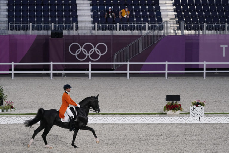 Dvaja ľudia na tribúne sledujú holandského jazdca Edwarda Gala na koni Glock's Total počas Grand Prix Letných olympijských hier 2020/2021 v Tokiu. Japonsko, Tokio, 24. júl 2021. Foto: SITA/AP