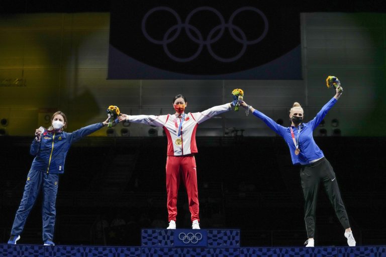 Zľava: Rumunka Ana Maria Popescu so striebornou medailou, Číňanka Sun Yiwen so zlatou medailou v šerme a bronz získala Estónka Katrina Lehis počas Letných olympijských hier 2020/2021 v Tokiu. Japonsko, Čiba, 24. júl 2021. Foto: SITA/AP