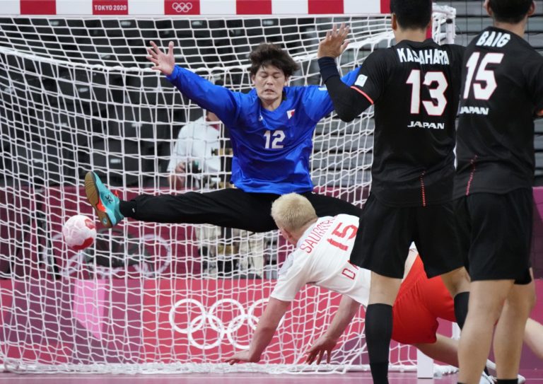 Dánsky hádzanár Magnus Saugstrup strieľa gól do brány japonskému hráčovi Yutovi Iwashitovi počas zápasu mužov skupiny A na Letných olympijských hrách 2020/2021 v Tokiu. Japonsko, Tokio, 24. júl 2021 Foto: SITA/AP