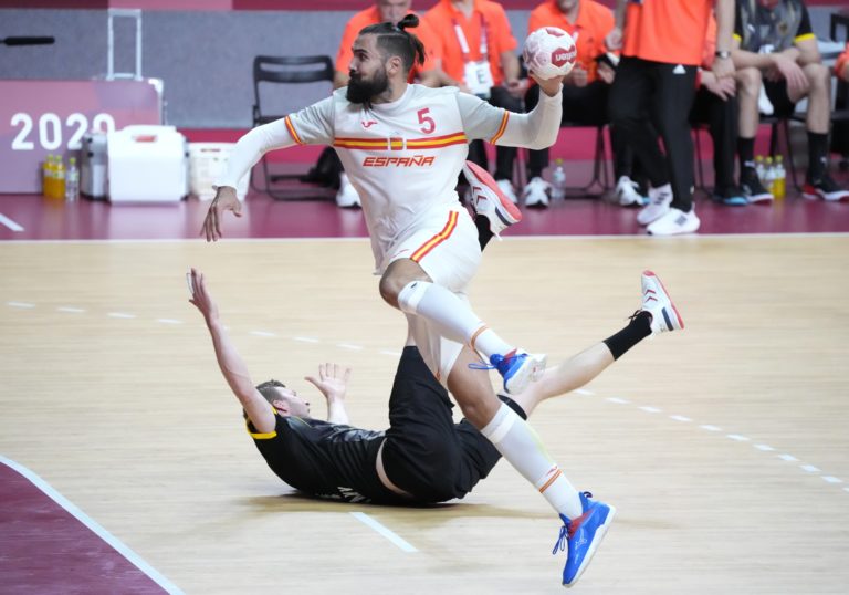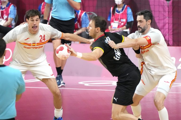 Španieli Viran Morros de Argila (vľavo) a Raul Entrerrios Rodriguez (vpravo) sa snažia získať loptu počas handbalového zápasu s Nemeckom na letných olympijských hrách v Tokiu. Japonsko, Tokio, 24. júla 2021. Foto: SITA/AP